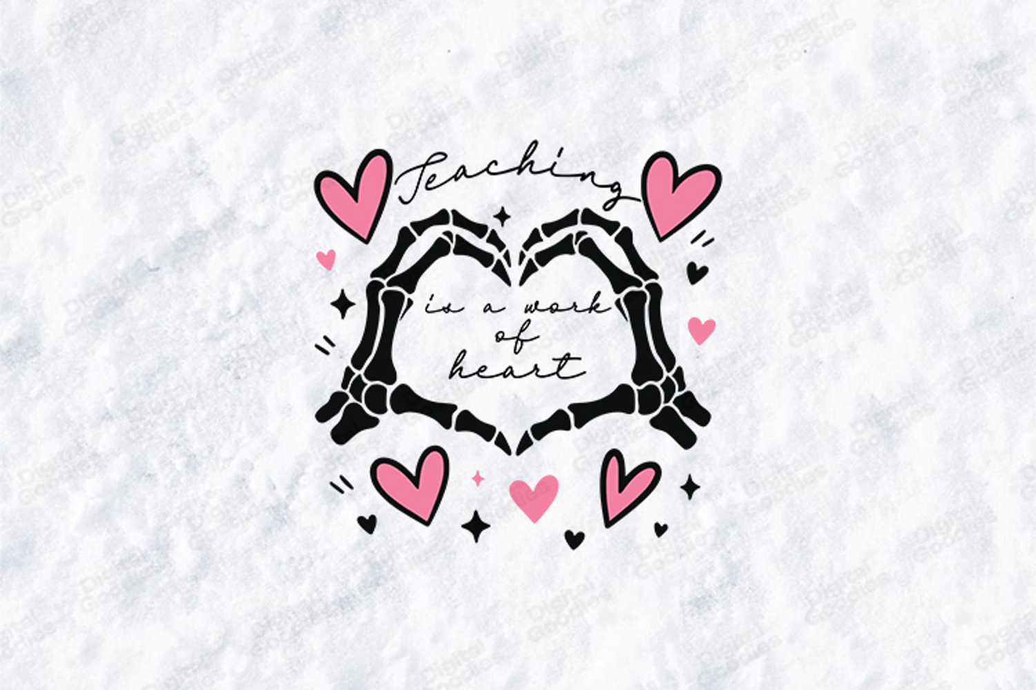 This high-quality digital illustration features an edgy and modern aesthetic, perfect for teachers who appreciate a unique take on classic school sentiments. The design showcases the phrase "Teaching is a work of heart" in a delicate, elegant script font. Centered around the text are two detailed skeleton hands forming a heart shape, surrounded by vibrant pink hearts and whimsical star accents. This striking artwork is an ideal choice for creating high-impact t-shirts, personalized tote bags, and stylish classroom decor.
