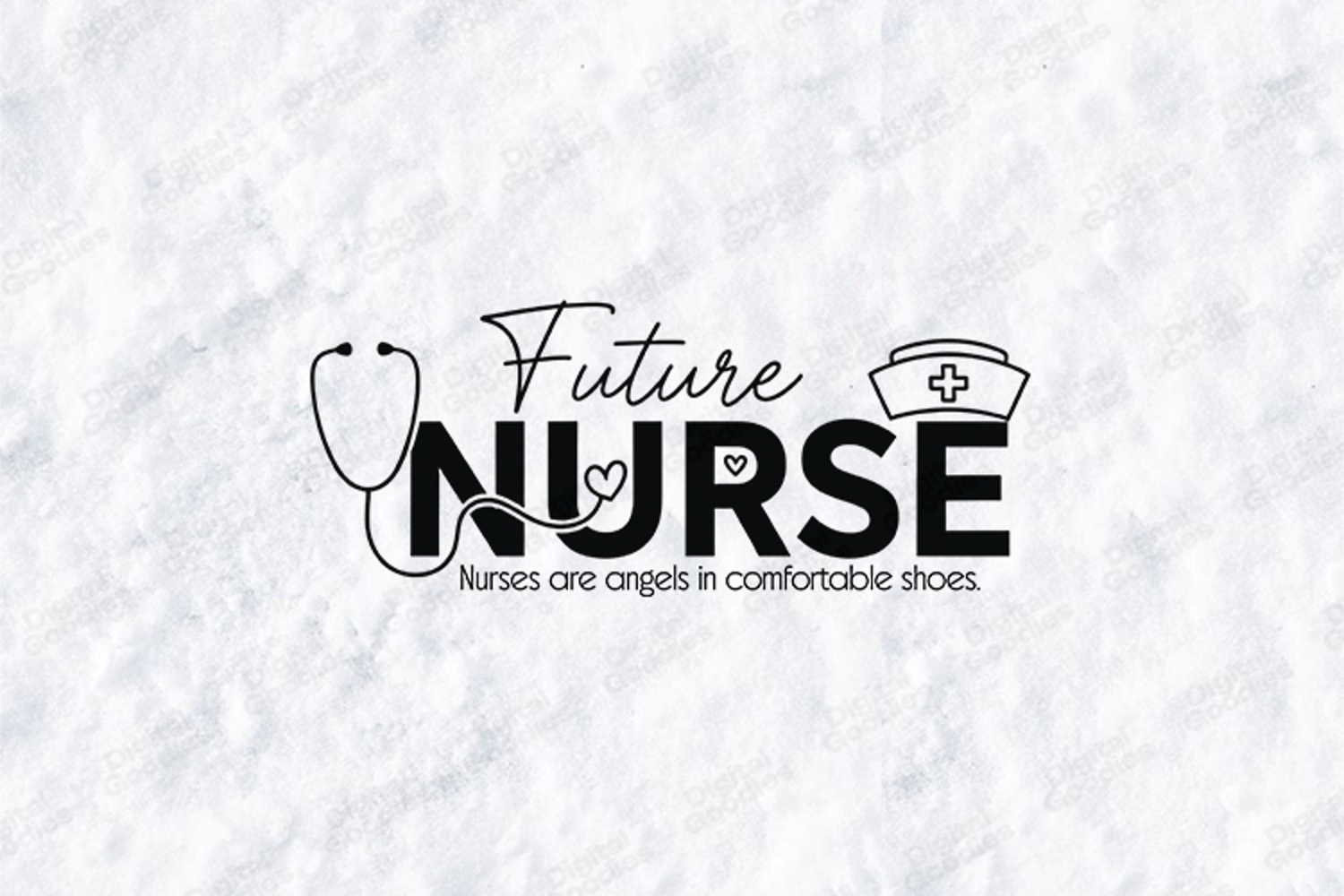 This high-quality digital illustration features a professional and modern aesthetic, perfect for nursing students and aspiring healthcare workers. The design showcases the bold word "NURSE" in a clean, sans-serif font, cleverly integrated with a detailed stethoscope and a heart-shaped icon. Accented with an elegant "Future" script overlay, a traditional nursing cap icon, and the inspiring quote "Nurses are angels in comfortable shoes," this artwork is an ideal choice for creating high-impact graduation t-shirts, personalized clinical notebooks, and motivational stickers.