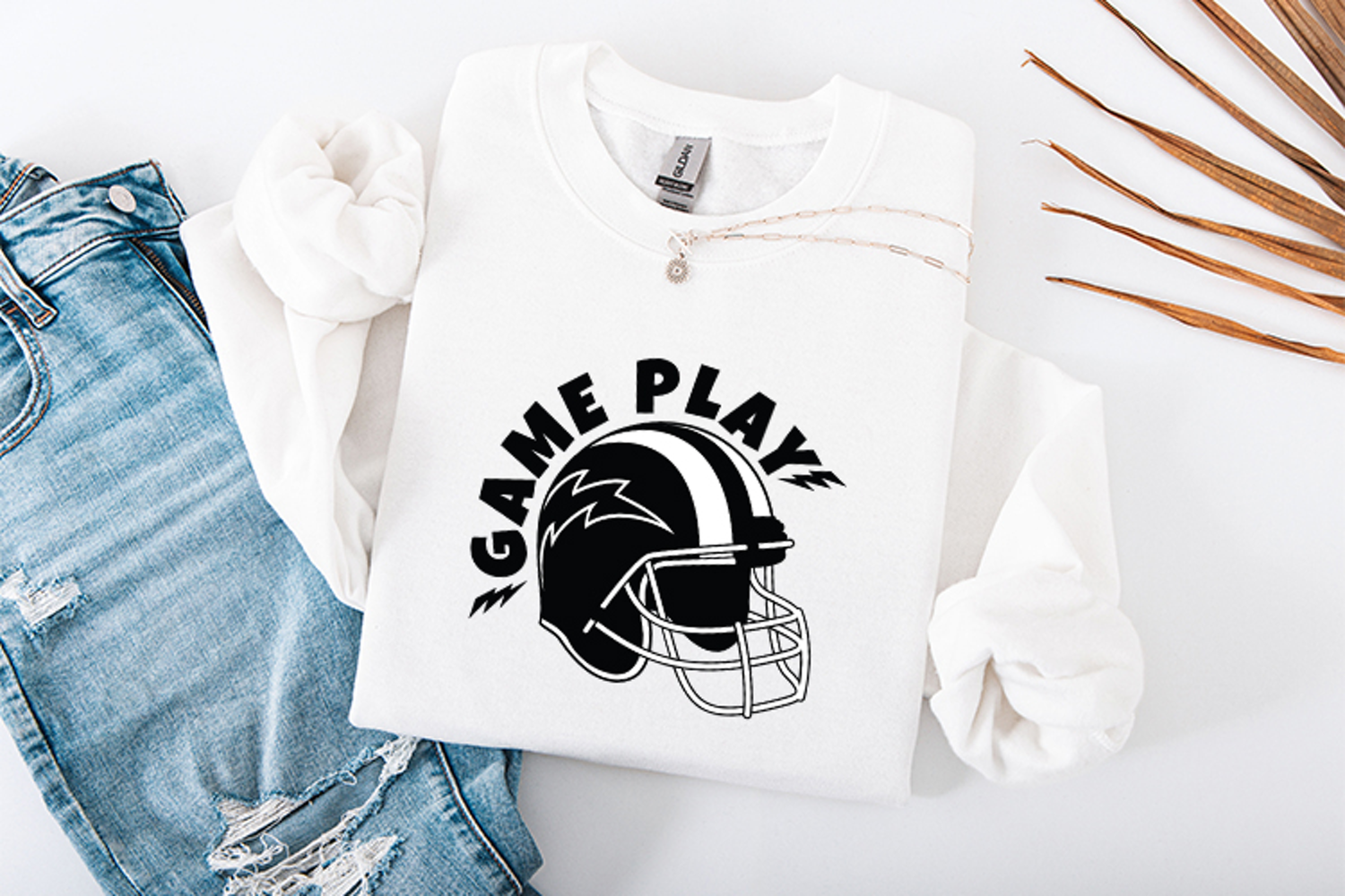 This professional digital graphic features a timeless athletic aesthetic, showcasing a large, detailed football helmet as the central focus. The helmet is accented with a dynamic lightning bolt decal and surrounded by clean, arced "GAME PLAY" varsity typography. Rendered in a high-contrast black-and-white palette, this design is the perfect choice for team warm-ups, student section apparel, or professional-grade fan gear.
