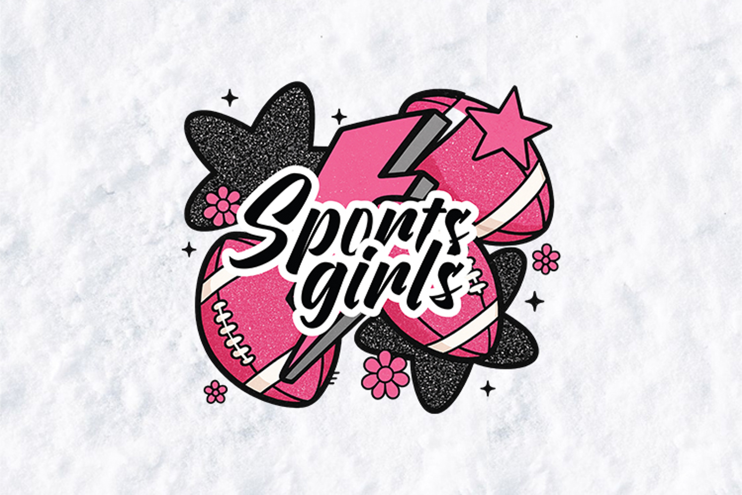 This professional-grade graphic is the ultimate choice for youth girls' football leagues, sports-themed birthday parties, and vibrant "Pink Out" spirit wear. The design features a maximalist aesthetic, showcasing two pink glitter-textured footballs and a bold pink lightning bolt. The central "Sports girls" text is presented in a modern, flowing black script with a clean white outline to ensure it pops against any background. Accented with black glitter stars, playful pink florals, and classic game-day stars, this design is perfect for custom t-shirts, varsity jackets, and spirit banners.