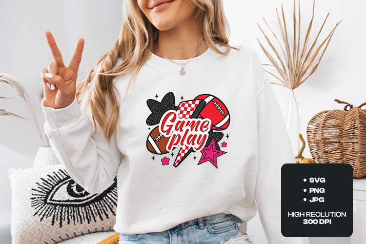 Elevate your game day gear with this vibrant "Game Play" football sublimation design. This high-quality graphic features a trendy mix of textures, including a glittery star, checkered lightning bolt, and classic footballs, all wrapped in a modern varsity aesthetic.