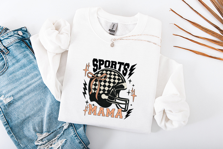Show off your pride on the sidelines with this trendy "Sports Mama" football design. This graphic features a striking checkered football helmet adorned with a delicate coquette bow, edgy lightning bolts, and sparkling stars.