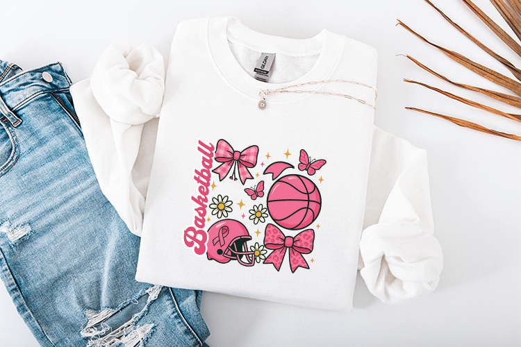 Support your favorite players and a great cause with this trendy Pink Basketball Awareness digital design. This high-quality graphic features a collection of stylish elements, including a vibrant pink basketball, a football helmet with an awareness ribbon, and various coquette-style bows in checkered and leopard print patterns.