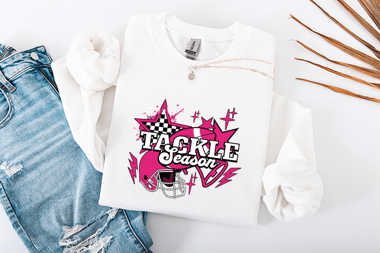 Support your team and a great cause with this vibrant "Tackle Season" digital design. This high-quality graphic features a bold collegiate-style font and a trendy "Pink Out" aesthetic, making it ideal for breast cancer awareness games and school spirit events.