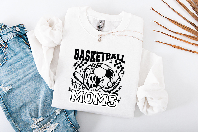 Show off your competitive edge with this unique "Basketball Moms" digital design. This high-impact, black-and-white graphic features a bold collegiate font paired with a large basketball, a stylized skull, and a baseball bat. Accented with checkered flags, lightning bolts, and stars, this "Streetwear" inspired design is perfect for moms who want a standout look at the game.