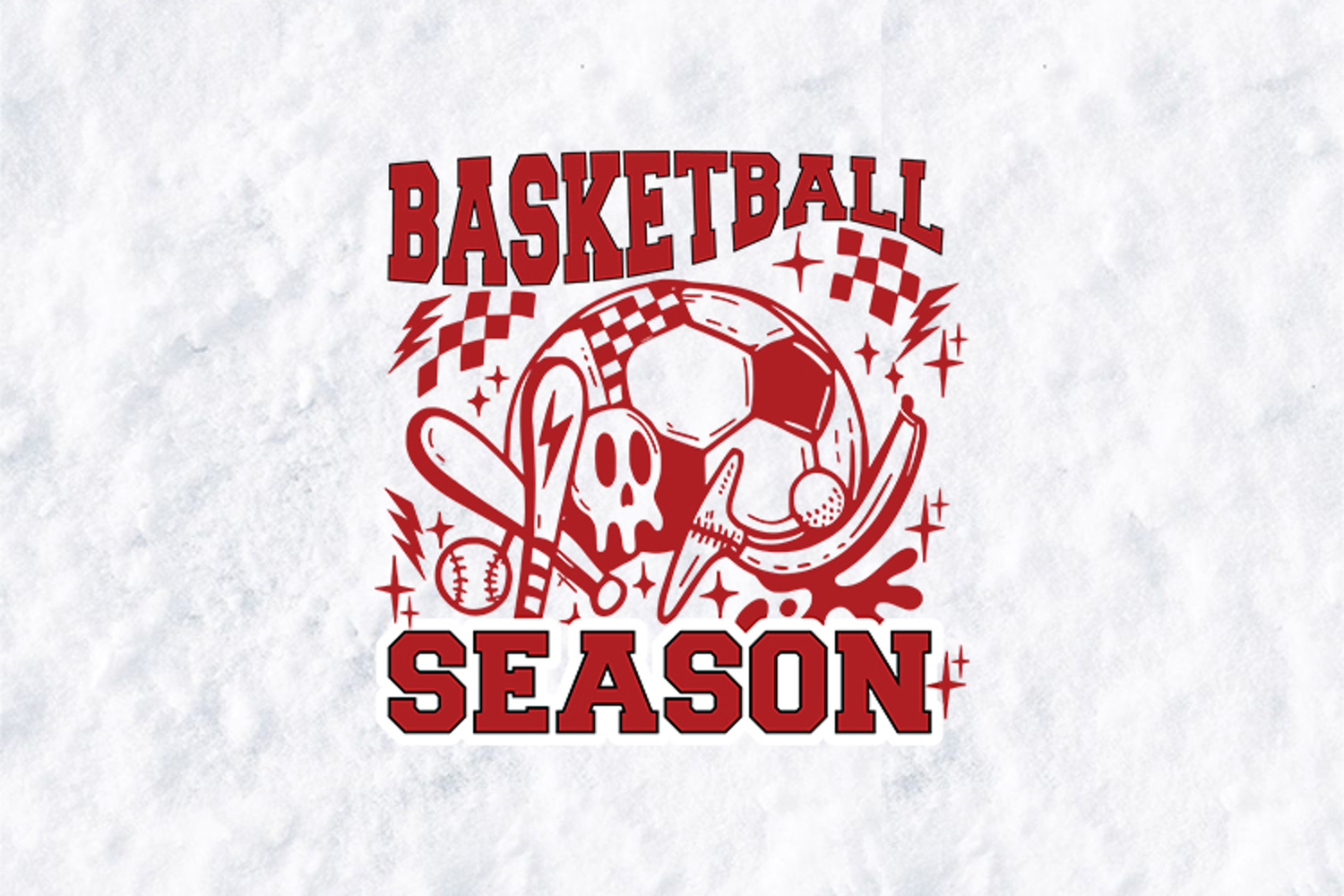 Bring an edgy energy to the court with this "Basketball Season" mashup graphic featuring a soccer ball, baseball bats, a baseball, and stylized skulls. Accented with lightning bolts and checkered flags, this bold red and white design is perfect for athletes who love every game. Ideal for sublimation on t-shirts, hoodies, and sports bags, this high-resolution illustration offers a unique, rebellious take on traditional varsity spirit wear.