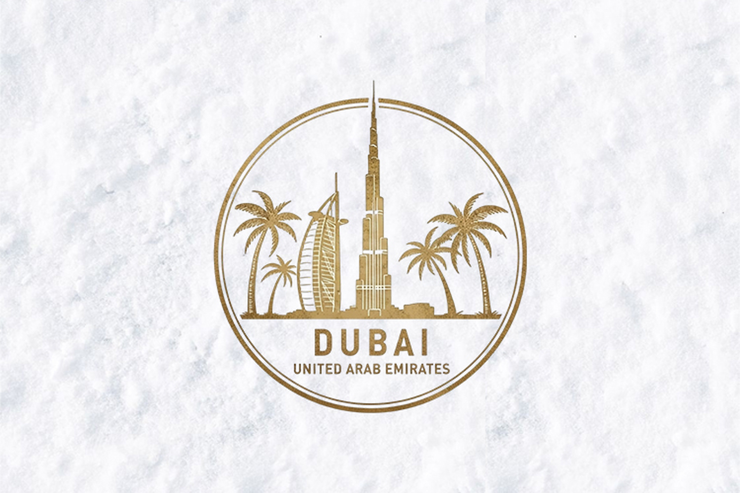 This premium design features the iconic architectural wonders of Dubai, including the Burj Khalifa and the Burj Al Arab, framed by tropical palm trees. Rendered in a sophisticated gold foil texture within a clean circular border, this graphic captures the opulent spirit of the Middle East, making it perfect for high-end souvenirs and modern decor.