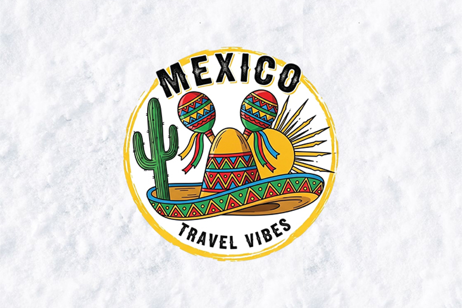 This high-quality design features a classic Mexican sombrero paired with colorful maracas and a tall saguaro cactus. Set against a bright yellow sun and framed within a hand-drawn circular border, this graphic uses a traditional palette of red, green, and yellow to create a cheerful, retro souvenir aesthetic.