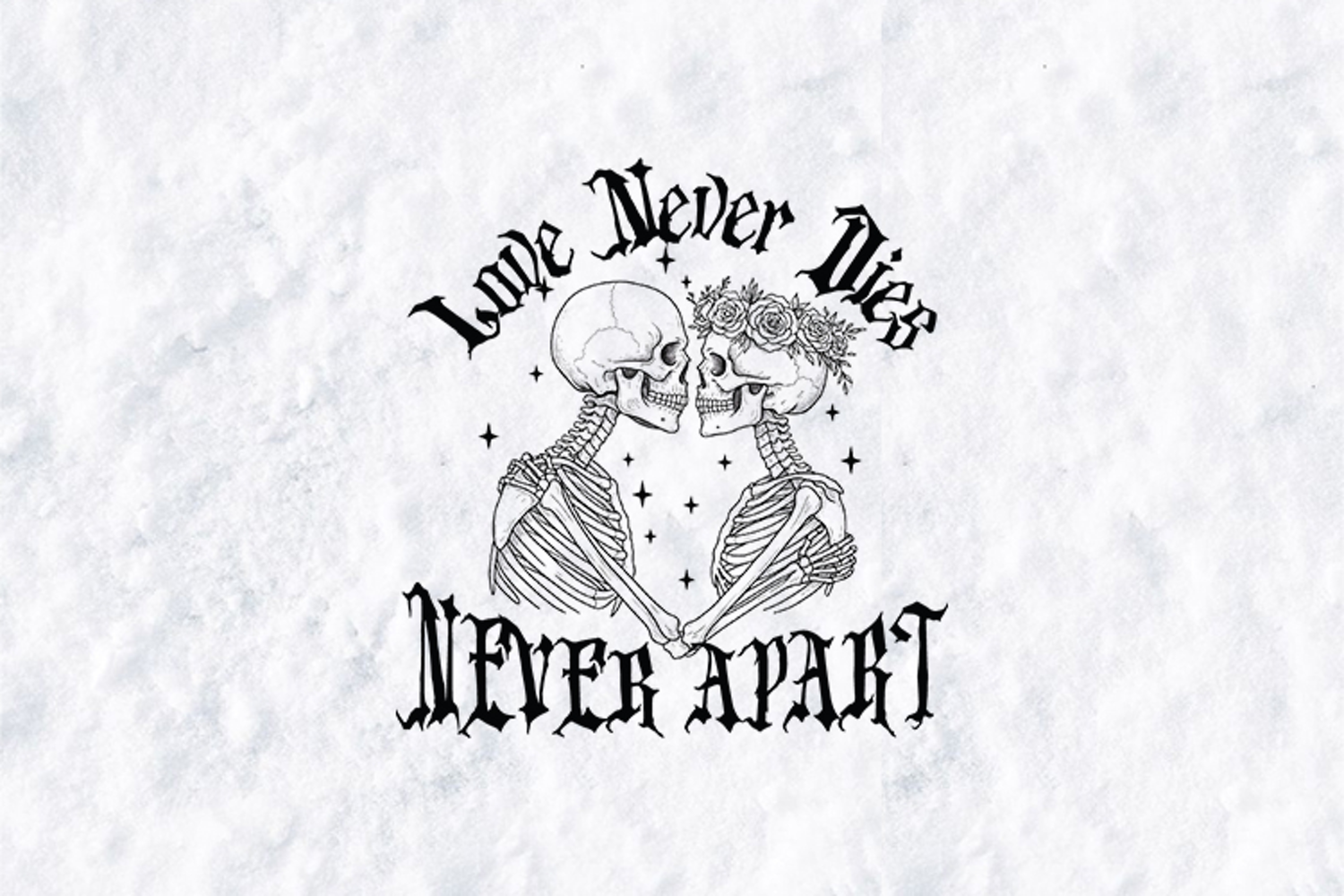 Capture the essence of eternal romance with this "Love Never Dies, Never Apart" gothic skeleton design. Featuring an intricate hand-drawn illustration of a skeleton couple and a floral crown, this high-quality PNG is perfect for those who prefer a darker, edgy aesthetic for Valentine's Day or wedding anniversaries.