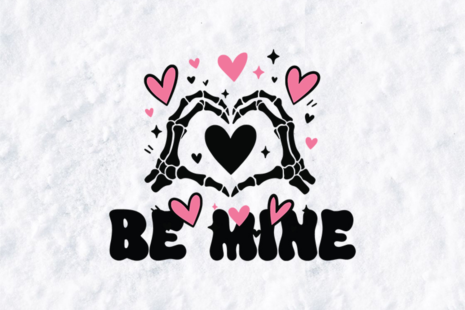 This high-quality digital graphic features hand-drawn Skeleton Hands forming a heart shape with a trendy, retro "Be Mine" typography. Perfect for those who love a mix of gothic aesthetic and romantic charm. Whether you are crafting for a partner, a "Galentine," or just yourself, this versatile design is ready for all your DIY projects.