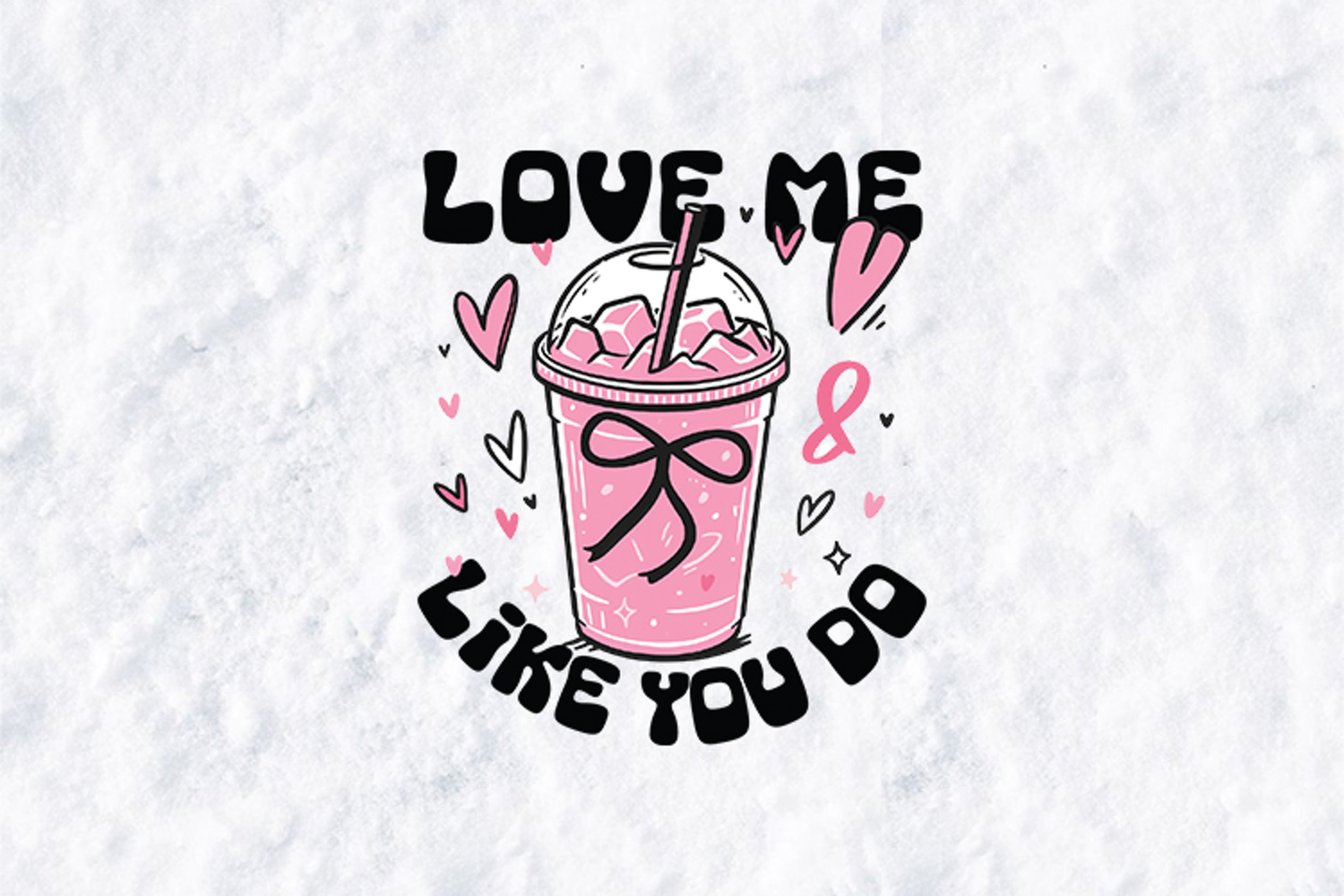 Featuring a stylish pink iced latte adorned with a classic black bow and hand-drawn hearts, this design is perfect for creating eye-catching apparel, mugs, and tote bags. The "Love Me Like You Do" wavy typography adds a nostalgic, vintage vibe that is currently trending on social media.