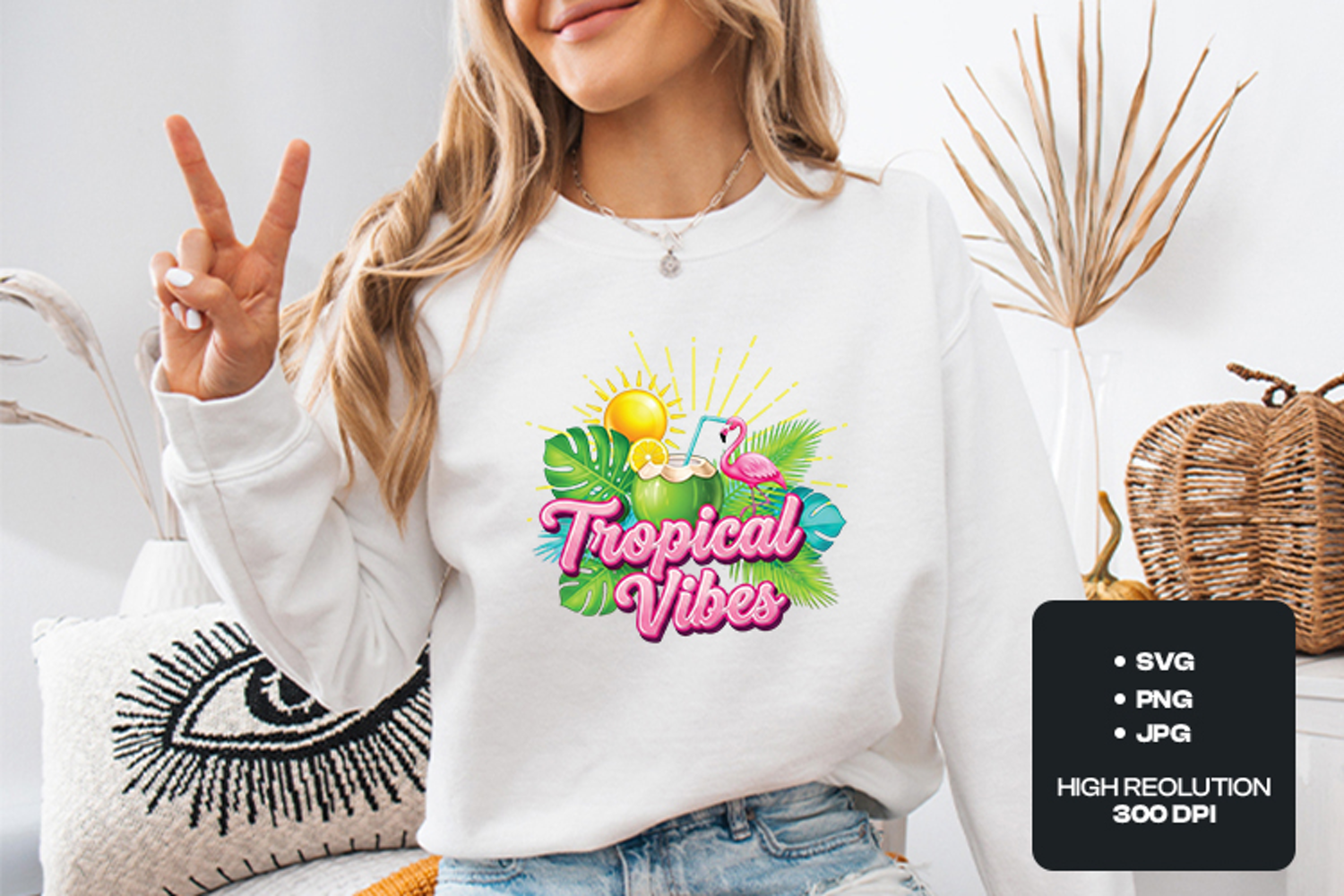 This vibrant and lush illustration features a refreshing coconut cocktail, a graceful pink flamingo, and a radiant sunburst. Surrounded by tropical Monstera and palm leaves, this high-energy design is perfect for anyone wanting to add a touch of paradise to their products.
