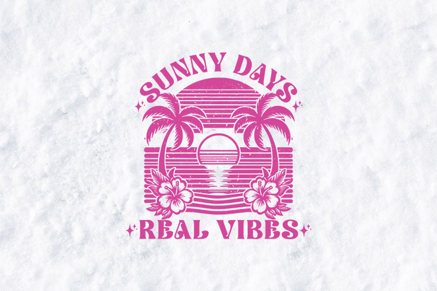 Embrace the heat with this Sunny Days Real Vibes Sublimation Design. Featuring a striking monochromatic pink palette, this graphic combines a vintage sunset, tropical palm trees, and elegant hibiscus florals for a modern take on retro surf style.
