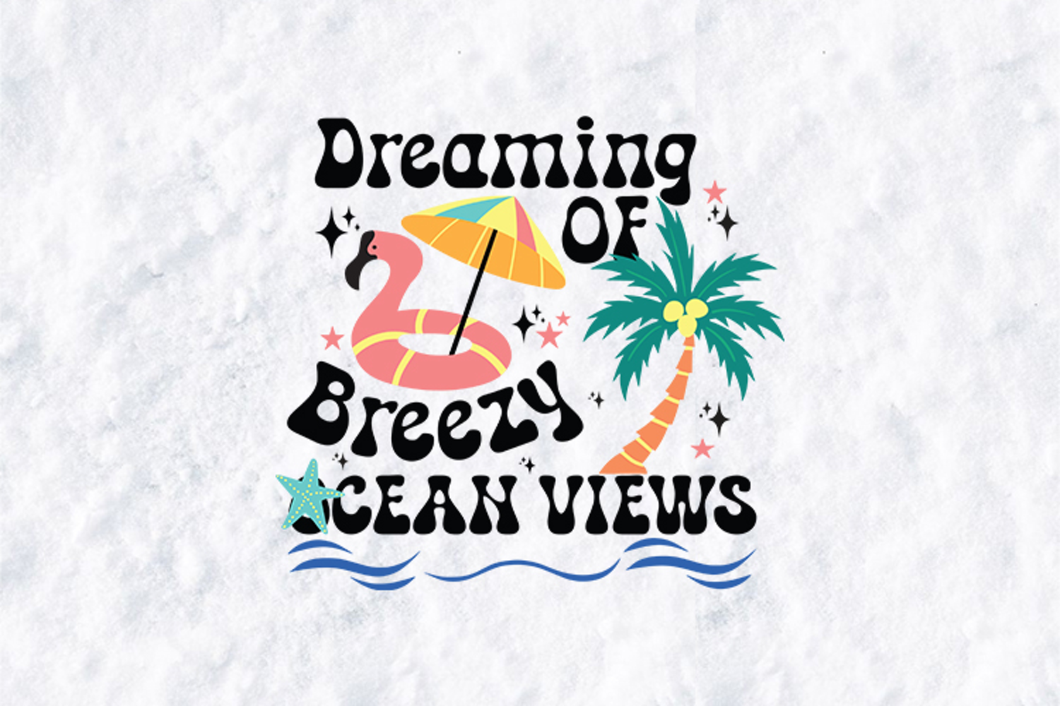 Relax and unwind with this Dreaming of Breezy Ocean Views Sublimation Design. This vibrant digital graphic features a trendy flamingo floatie, a colorful beach umbrella, and a tropical palm tree, all tied together with retro-style typography.