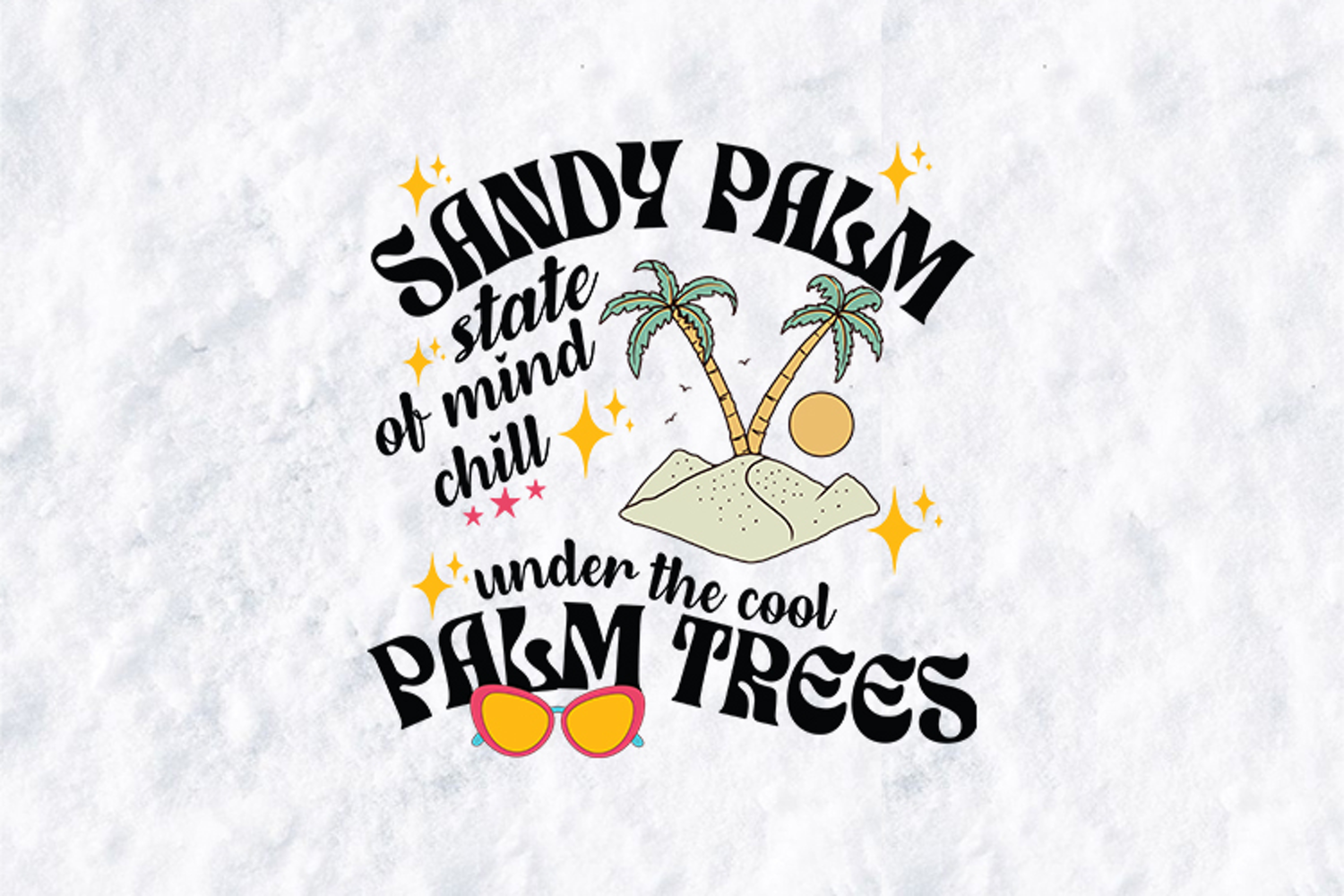 Relax and recharge with this Sandy Palm State of Mind Sublimation Design. This high-quality digital graphic features a serene island scene with two palm trees, a warm sun, and trendy pink sunglasses, all tied together with playful, retro-style typography.