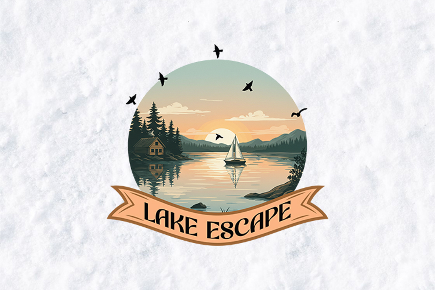 Featuring a picturesque lakeside scene, this design captures a peaceful sunset over the mountains, complete with a cozy log cabin, a graceful sailboat, and soaring birds. The vintage-inspired circular composition and elegant ribbon banner make it an ideal choice for creating professional-grade products for nature enthusiasts and travelers.