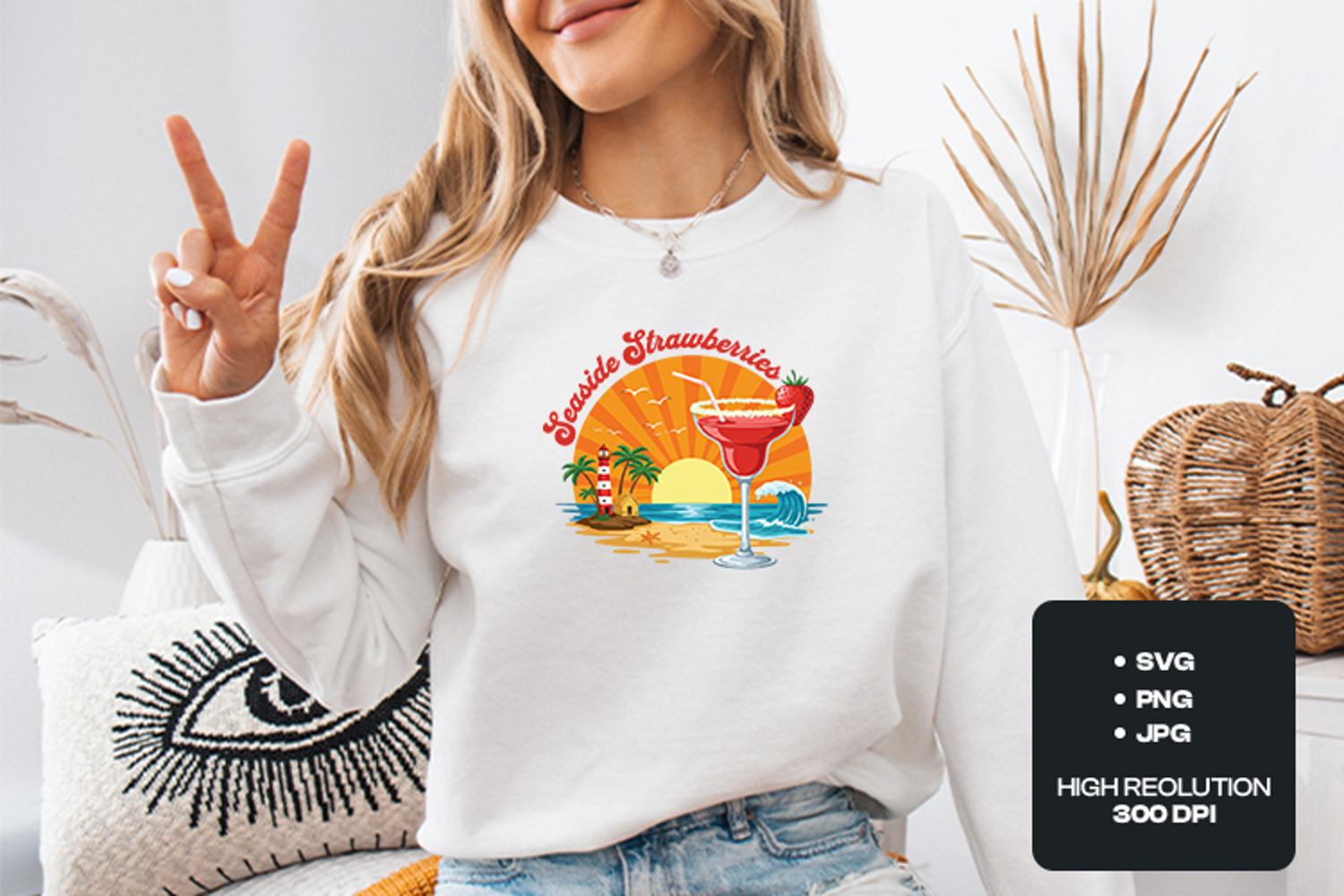 This high-quality graphic features a vibrant strawberry margarita set against a stunning coastal sunset. Complete with a classic lighthouse, palm trees, and a crashing ocean wave, this retro-inspired design is perfect for summer-themed crafts and merchandise.