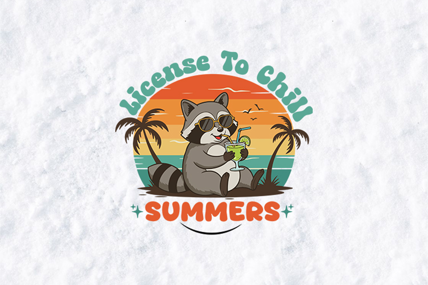 This design features a laid-back raccoon wearing sunglasses and enjoying a tropical drink against a classic 70s-style sunset. With palm trees and ocean waves, it’s the perfect blend of humor and vintage aesthetics for your summer projects.