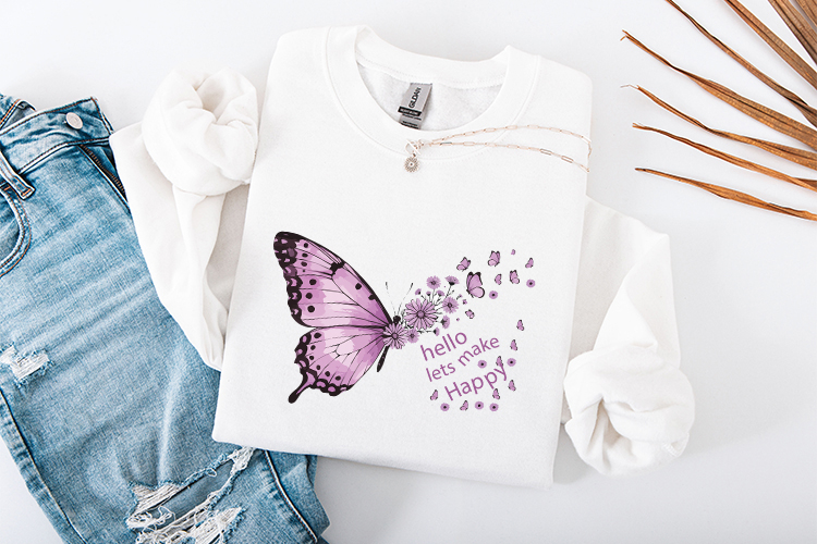 Spread joy and transformation with the "Hello Lets Make Happy" floral butterfly design. This high-quality digital illustration features a soft, artistic aesthetic that blends nature and positivity, making it perfect for creating professional-grade feminine apparel, inspirational wall art, and delicate stationery.