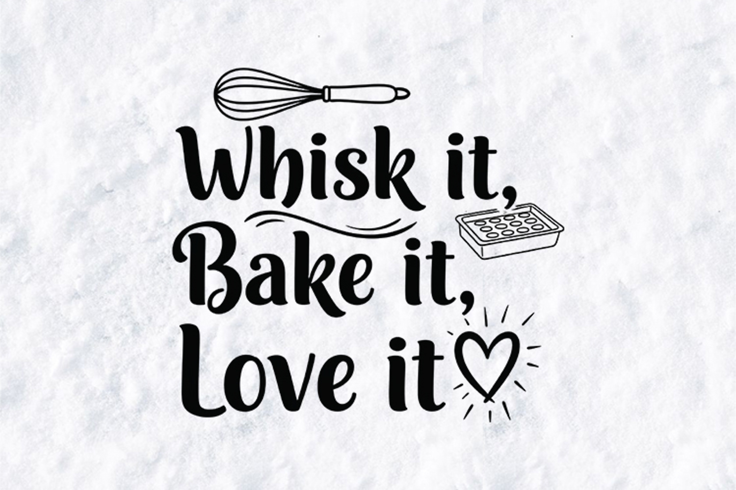 Add a touch of sweetness to your kitchen projects with this "Whisk it, Bake it, Love it" digital design. This charming hand-lettered quote, featuring a whisk and cupcake tray illustration, is perfect for professional bakers and home hobbyists alike.