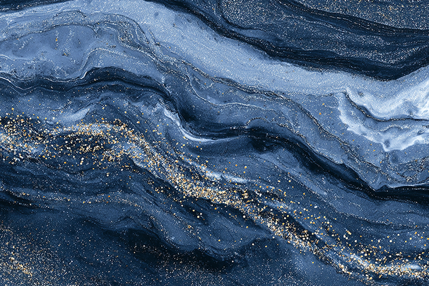 A stunning dark blue and gold abstract marble pattern. The swirling waves of color create a sense of movement and energy, while the glittering specks add a touch of luxury and sophistication. The overall effect is one of modern elegance and artistic expression.
