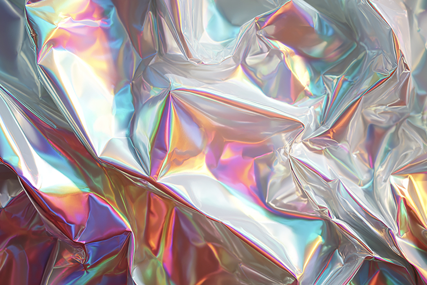 Crumpled holographic foil with a mesmerizing array of vibrant colors and reflective surfaces. The foil's textured, abstract surface creates a sense of depth and visual interest, making it perfect for use in design, art, and creative projects. The holographic effect adds a touch of modernity and futurism, while the crumpled texture gives the image a sense of organic, natural beauty.