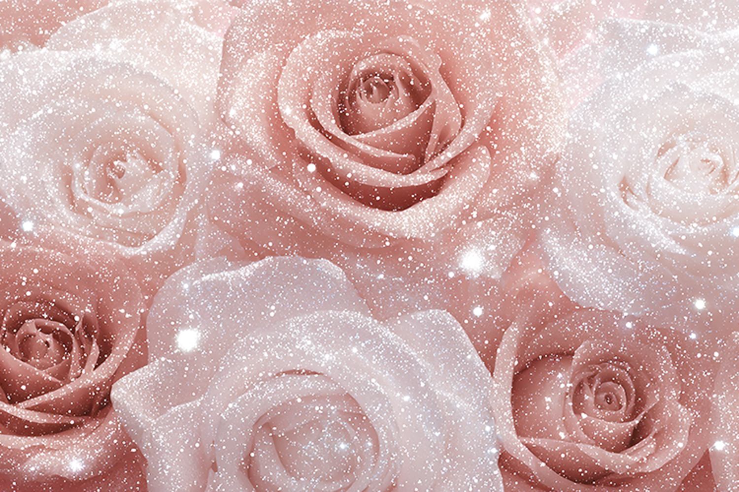 Pink roses adorned with glitter and sparkles on a soft background. The delicate petals and romantic ambiance evoke a sense of elegance and serenity. The high-quality photography showcases the intricate details of the flowers, making it perfect for use in various design and artistic applications.