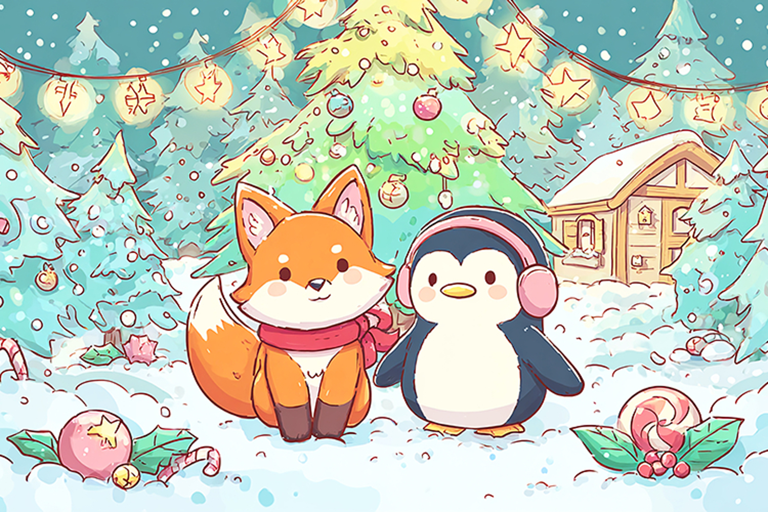 A cartoon fox and penguin enjoying a festive winter scene. The duo is surrounded by Christmas trees, decorations, and snow, creating a joyful and playful atmosphere. The fox wears a red scarf, while the penguin sports pink headphones, adding to the illustration's charm. The image is perfect for those looking for a fun and cheerful winter-themed visual.