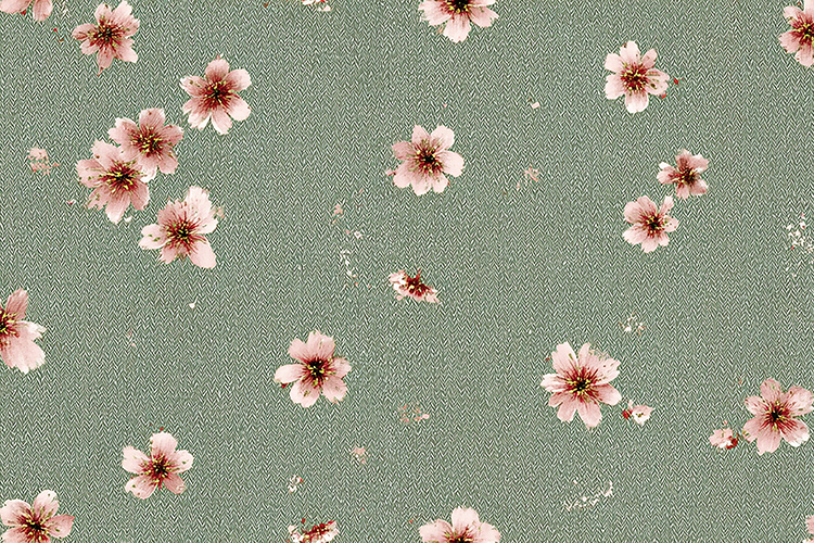 a stunning floral pattern with pink flowers scattered across a soft green background texture. The delicate petals and gentle colors evoke a sense of elegance and beauty, perfect for inspiring interior design, decoration, or fashion projects. The subtle texture adds depth and visual interest to the overall design.