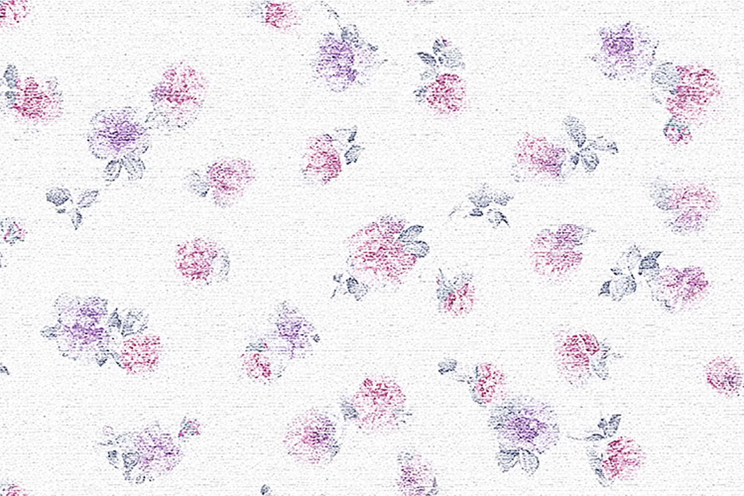 Floral pattern on a white textured background. The design showcases a mix of pink and purple flowers in a subtle and elegant arrangement. The soft focus and gentle hues create a soothing visual effect, making it perfect for use in interior decor, wallpaper, or fabric design. The intricate artwork adds a touch of charm and visual interest to any setting.