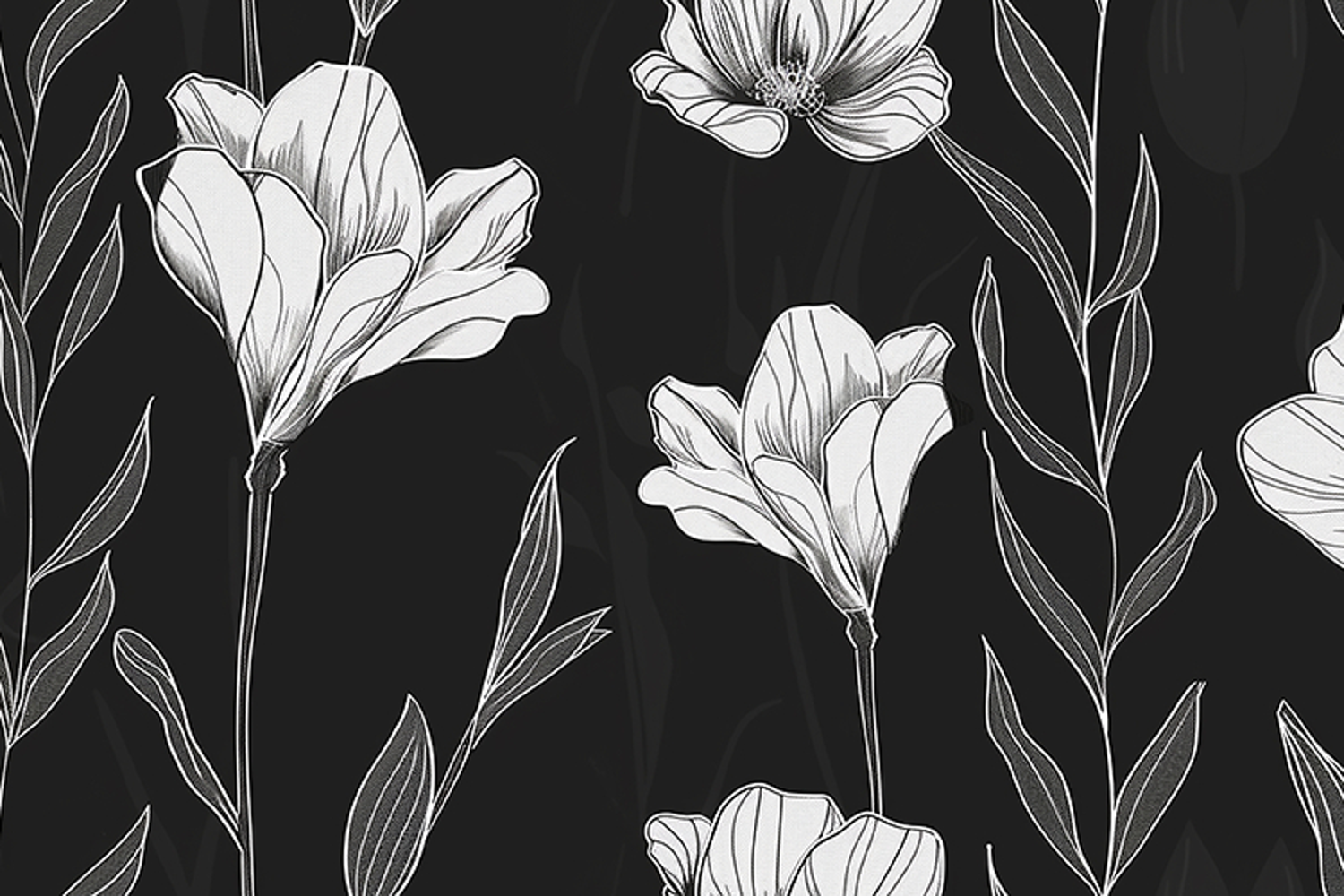 Black and white floral pattern featuring beautiful flowers and leaves on a dark background. The illustration is elegant, simple, and minimalist, making it perfect for use as a wallpaper, decoration, or design element. The monochromatic color scheme gives the pattern a timeless and sophisticated look, while the botanical details add a touch of nature and beauty.