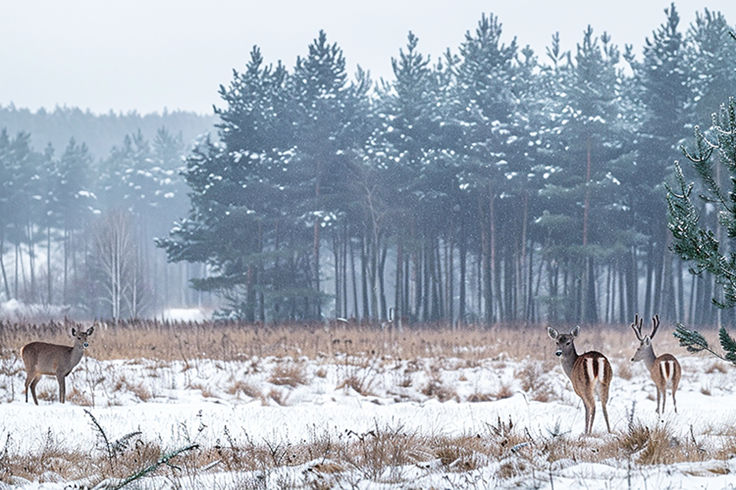 Nature Snow Forest Deer Wildlife Trees Cold Weather Winter Landscape Foggy Day Snowy Field