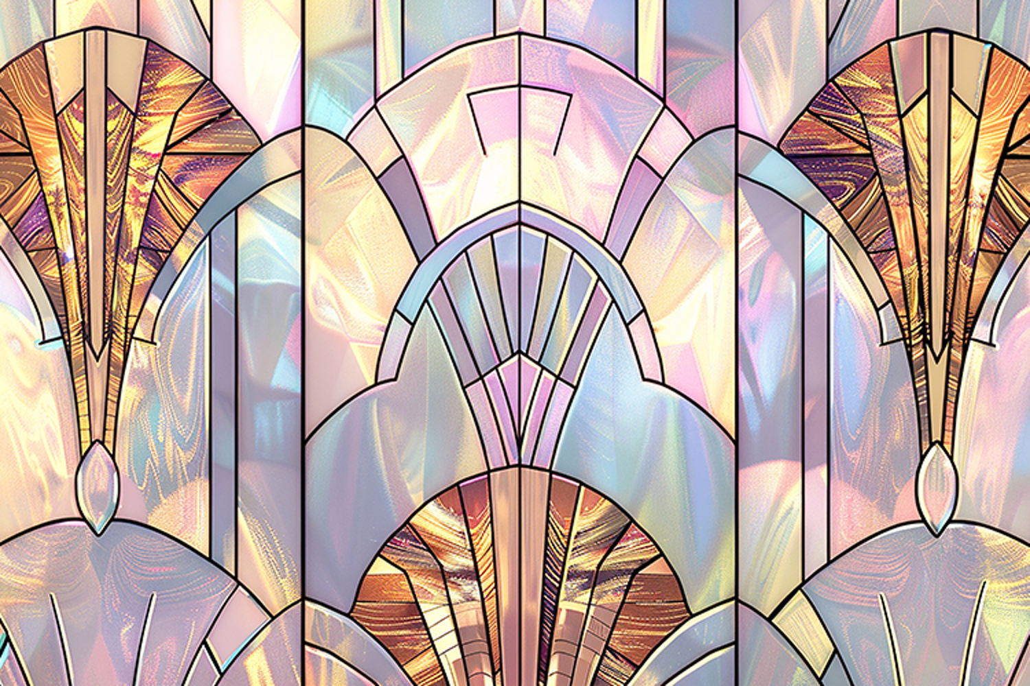 Stained glass window with an art deco design. The window is composed of multiple panels with intricate patterns and shapes in pastel colors, including shades of pink, blue, and yellow. Golden accents add a touch of luxury and sophistication to the overall design. The art deco style is characterized by geometric shapes, bold lines, and ornate details, which are all evident in this stunning stained glass window.