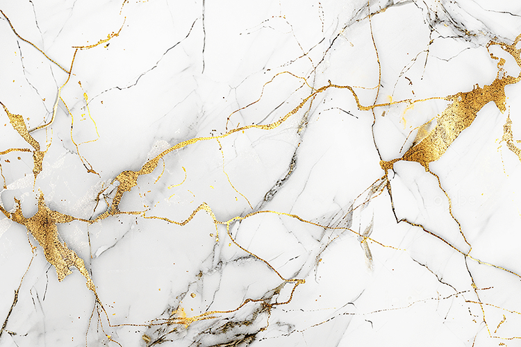 White marble texture with intricate gold and gray veins, perfect for luxury design and interior design projects. The elegant and sophisticated pattern of the marble surface adds a touch of glamour and high-end style to any setting. The metallic shine of the gold veins catches the eye, giving the image a sense of luxury and refinement.