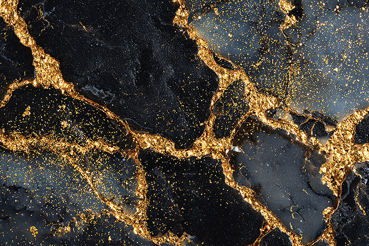 Black marble surface adorned with intricate golden veins and sprinkled with sparkling gold dust. The luxurious texture and pattern evoke a sense of sophistication and elegance, perfect for high-end interior design and decoration. The shiny, metallic luster of the gold accents adds a touch of glamour and opulence, making this image ideal for showcasing luxury materials and designs.