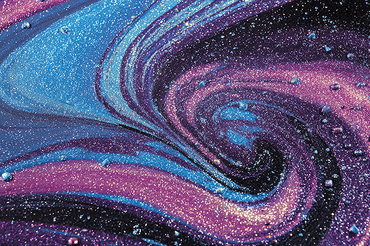 Swirl of purple, blue, and pink glittery patterns set against a sleek black background. The vibrant colors and sparkly textures create a cosmic effect, reminiscent of a galaxy or nebula. The artwork's creative design and radiant glow make it a beautiful and inspiring piece, perfect for adding a touch of personality to any room or wall.