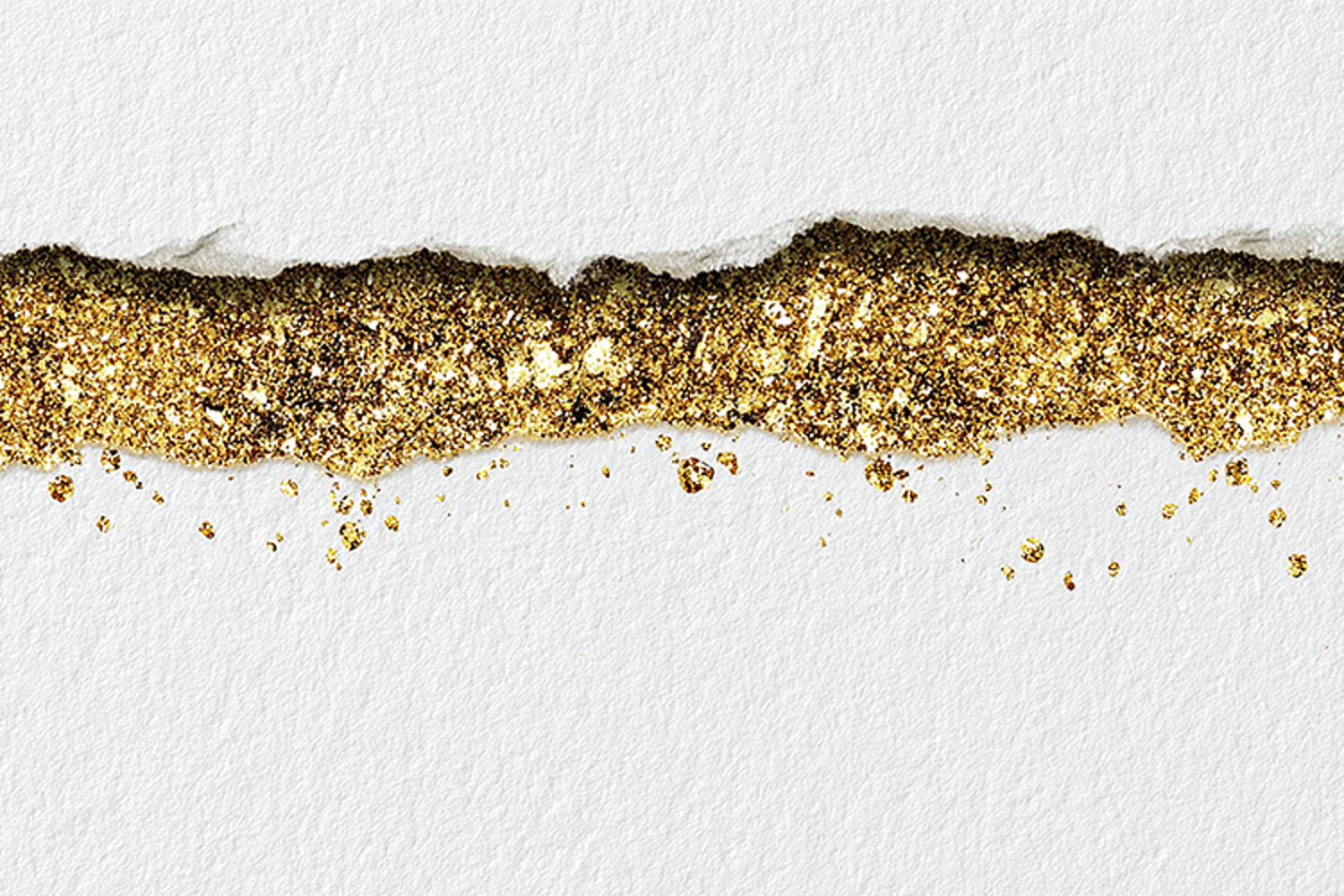 A torn piece of white paper revealing a strip of gold glitter underneath, creating a decorative and creative element for art and craft projects.