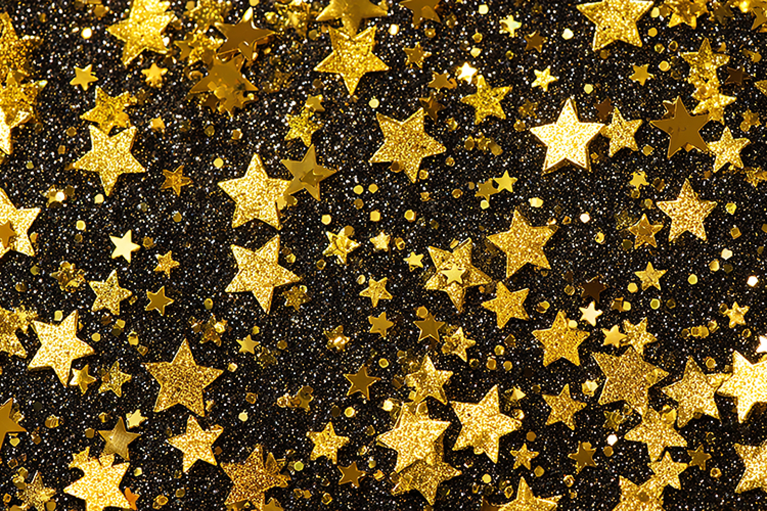 Gold star pattern on black background with glittery texture