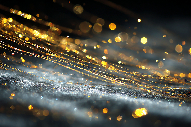 Golden lights and bokeh effects set against a dark background. The sparkling lights and glowing orbs create a sense of movement and energy, drawing the viewer's eye through the shimmering strings and light trails. The blurry lights and golden orbs add a sense of depth and dimensionality to the image, while the dark scene and glowing lights create a dramatic and vibrant atmosphere.