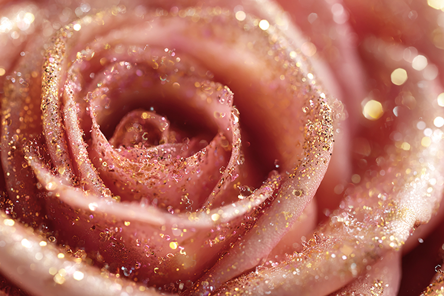Pink rose, its delicate petals covered in a generous amount of glitter. The sparkle adds a touch of luxury and glamour to the already elegant flower, making it perfect for romantic occasions, special celebrations, or as a beautiful decoration. The image showcases the intricate details of the rose, highlighting its natural beauty and the added sparkle of the glitter.
