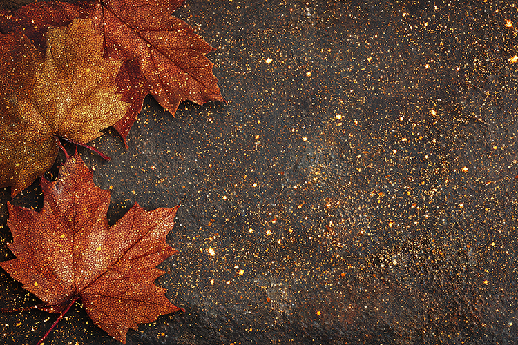 Autumn leaves on a dark textured background with golden specks. The leaves display a range of warm colors, from deep reds and oranges to golden browns. The dark background adds depth and contrast to the image, while the golden specks create a sense of sparkle and shine. The overall effect is a cozy and inviting representation of the fall season.