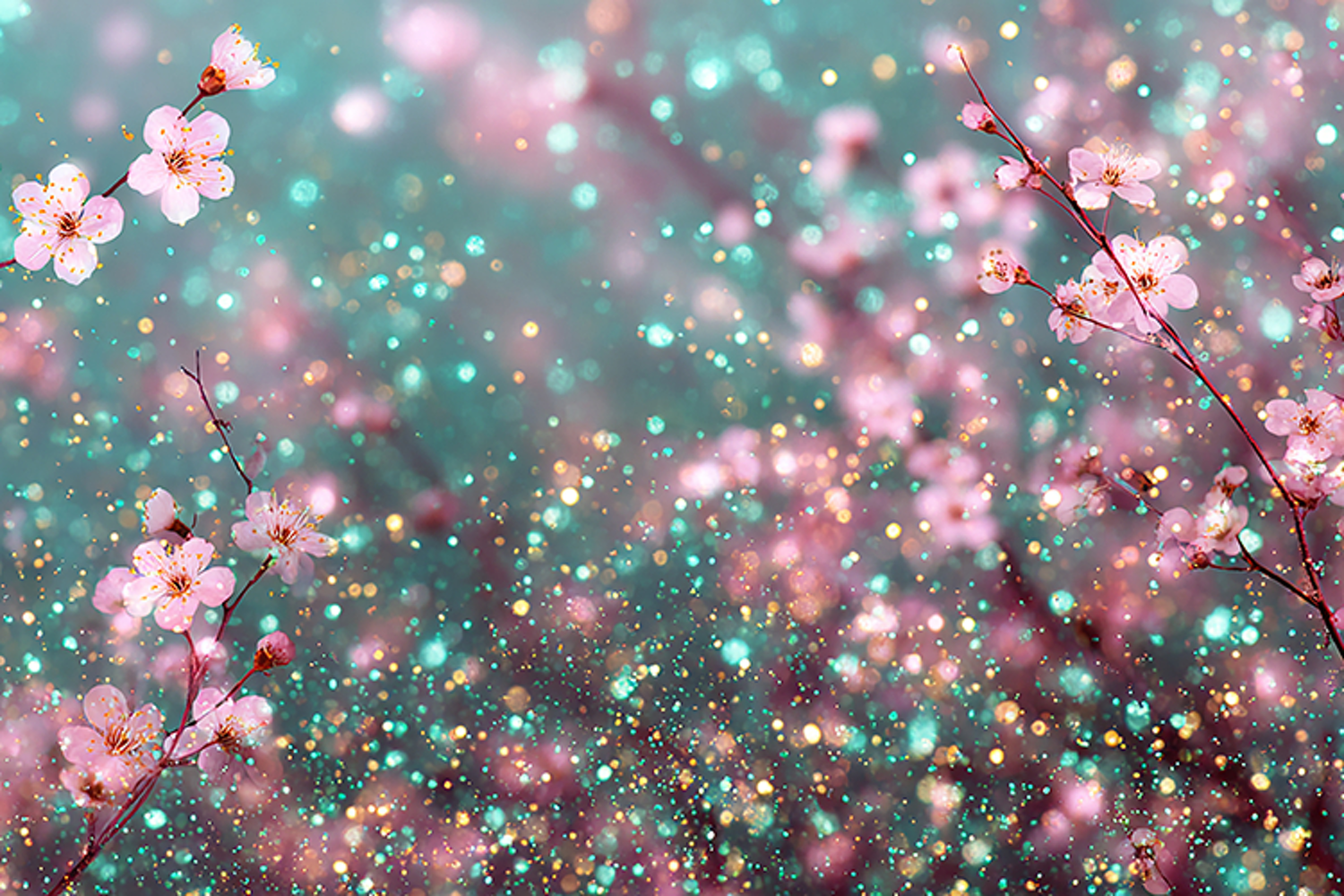 Floral background with pink cherry blossoms and sparkling glitter. The soft focus and pastel colors create a dreamy and artistic atmosphere, perfect for use as a background or wallpaper. The image captures the essence of spring and the beauty of nature, with the blossoms and glitter adding a touch of magic and whimsy.