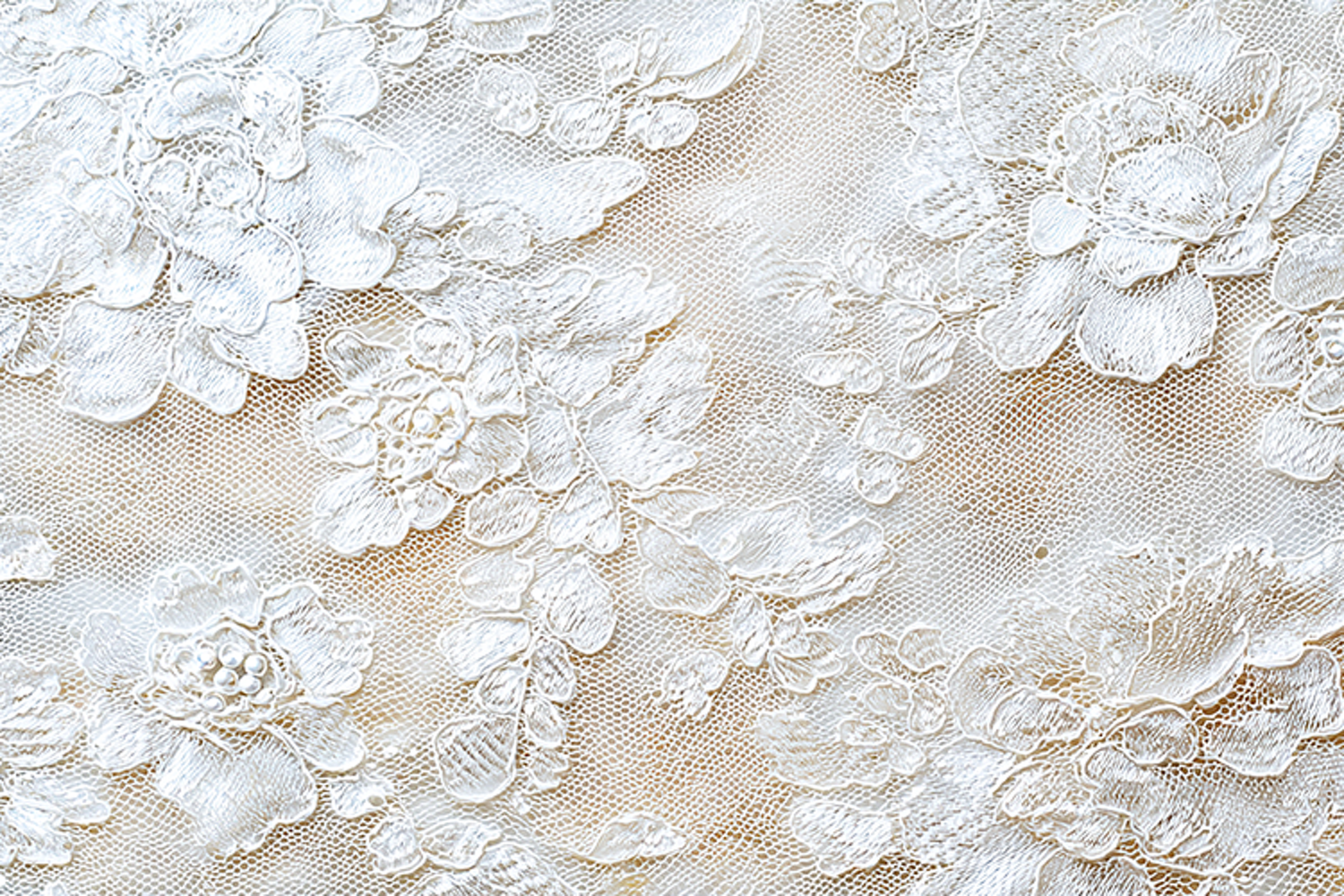 White lace fabric adorned with intricate floral patterns and designs. The delicate texture and beautiful craftsmanship of the lace make it perfect for use in wedding dresses, bridal veils, and other fashion applications. The intricate stitching and embroidery create a sense of luxury and sophistication, making this fabric ideal for high-end fashion designs.