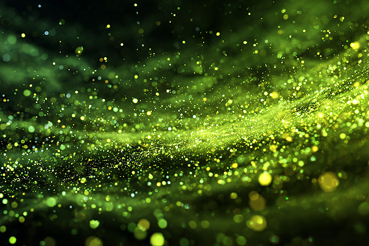 Green abstract background filled with sparkling particles and glowing lights. The dynamic scene is characterized by swirling motions and shimmering effects, creating a sense of energy and movement. The vibrant colors and dazzling lights make this image perfect for use in creative projects, designs, and digital media where a stunning visual impact is desired.