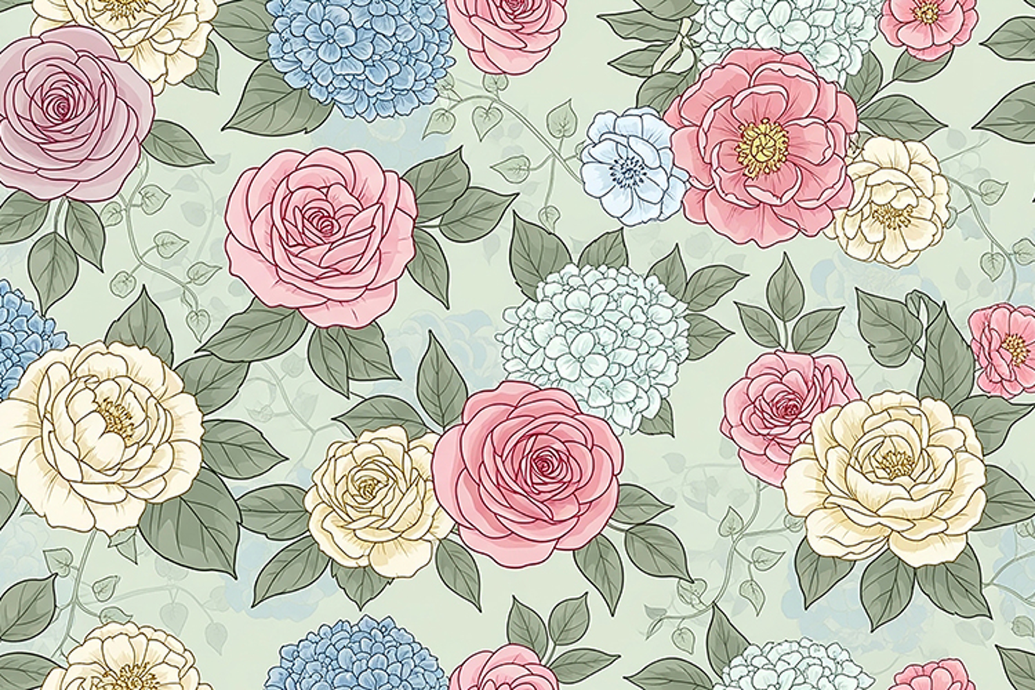 Floral pattern with roses and hydrangeas in soft pastel colors, set against a light green background. The illustration is reminiscent of vintage wallpaper or fabric design, with delicate petals and leaves that evoke a sense of elegance and timelessness.