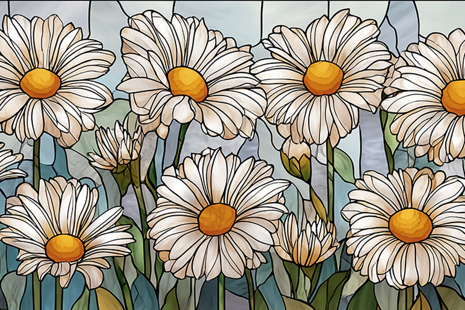 Stained glass window with a field of white daisies and yellow centers. The intricate design a beautiful pattern of flowers, stems, and leaves against a blue background. The stained glass style adds a touch of elegance and sophistication, making this piece a unique work of art.