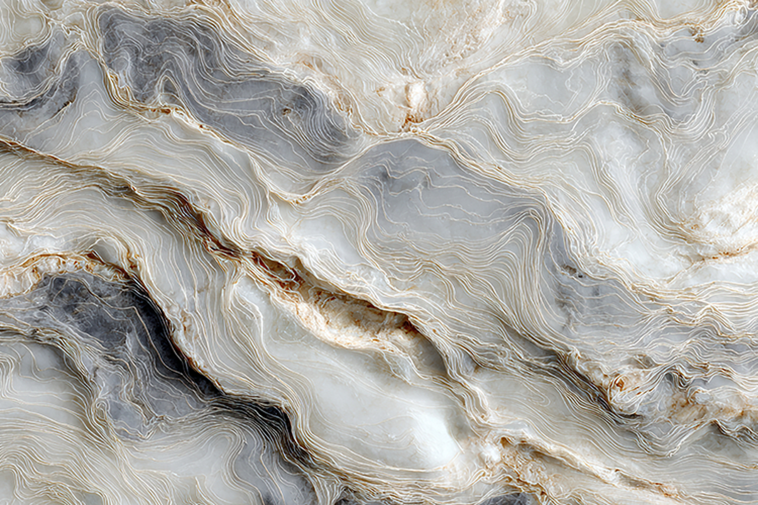 Marble surface, featuring intricate patterns and swirling designs. The natural beauty of the stone, with its smooth texture and elegant curves. The gray, white, and black hues are complemented by subtle brown veining, adding depth and sophistication to the overall appearance. This image would be perfect for interior designers, architects, and anyone looking for inspiration for their next project.