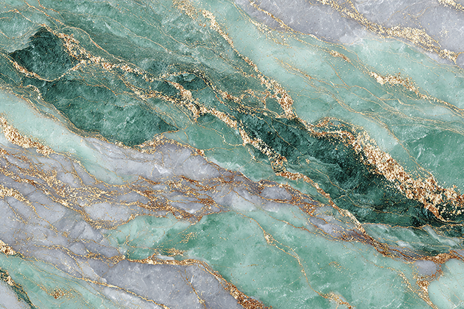 Green marble texture with intricate gold veins, perfect for designers and architects looking for a luxurious and sophisticated material for their projects. The natural pattern and elegant appearance of the marble make it ideal for interior decoration, including walls, floors, and surfaces. The high-quality image provides a detailed and close-up view of the marble's unique visual appeal and aesthetic.