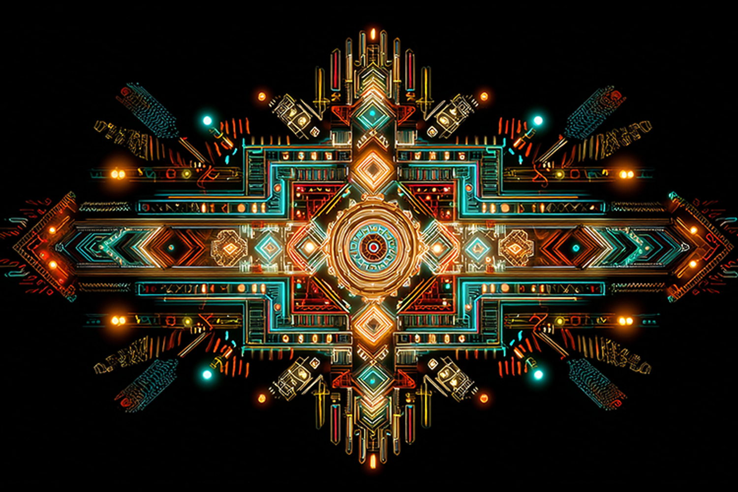 Geometric pattern with a mix of colorful shapes and designs set against a sleek black background. The intricate art piece showcases a blend of modern style and traditional motifs, creating a visually striking effect. The symmetry and ornate details of the pattern add to its aesthetic appeal, making it a unique and captivating visual representation.