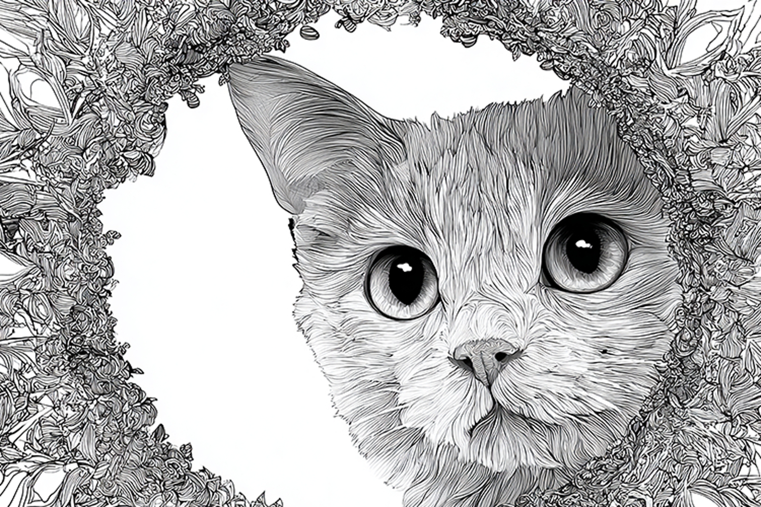 Illustration Animal Black And White Drawing Cat Kitten Mammal Floral Frame Big Eyes Curious